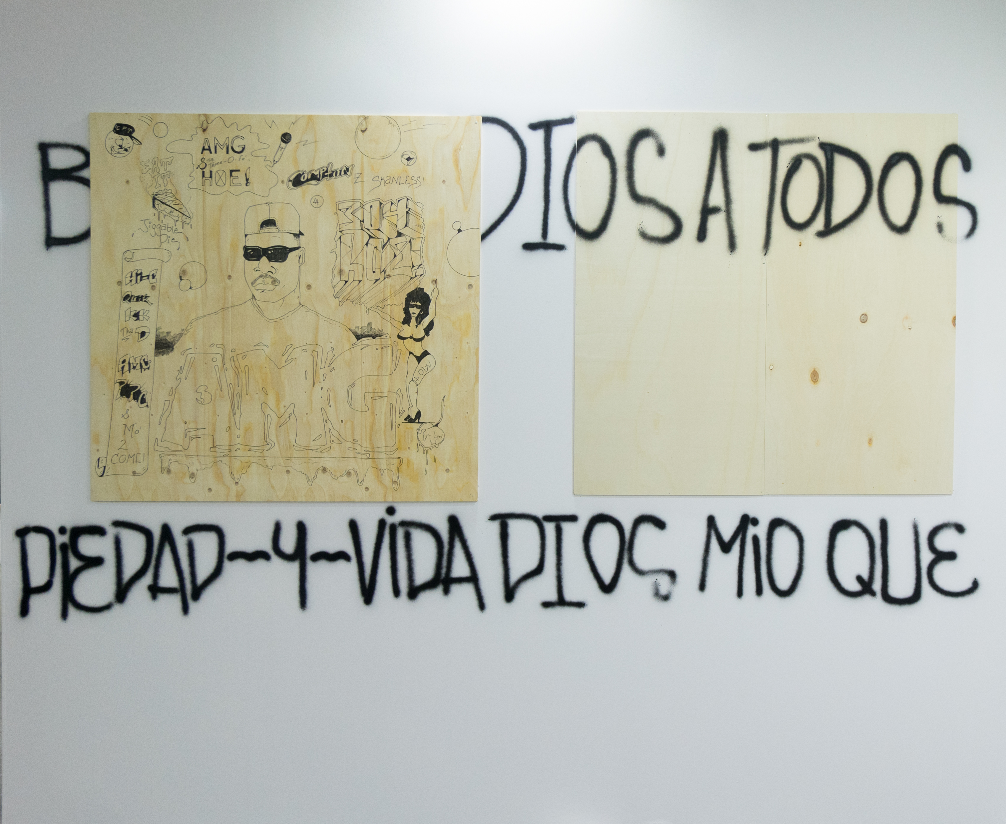 The presentation of the installation contains MDF boards taken from the L.A. riots and presented in as close to its original form as possible as shops and buildings were boarded up and covered by cryptic Hispanic graffiti. The other works in the show depict an abstract interior of child’s living room growing up during the period, watching the news broadcasts whilst enjoying a chocolate milk unaware of the paradox that would take place 30 years later in the wake of BLM and the tragic deaths of Brianna Taylor, George Ffloyd and many others murdered through Police Brutality, stemming from Darryl Gates rise to power as the L.A. county police commissioner.
