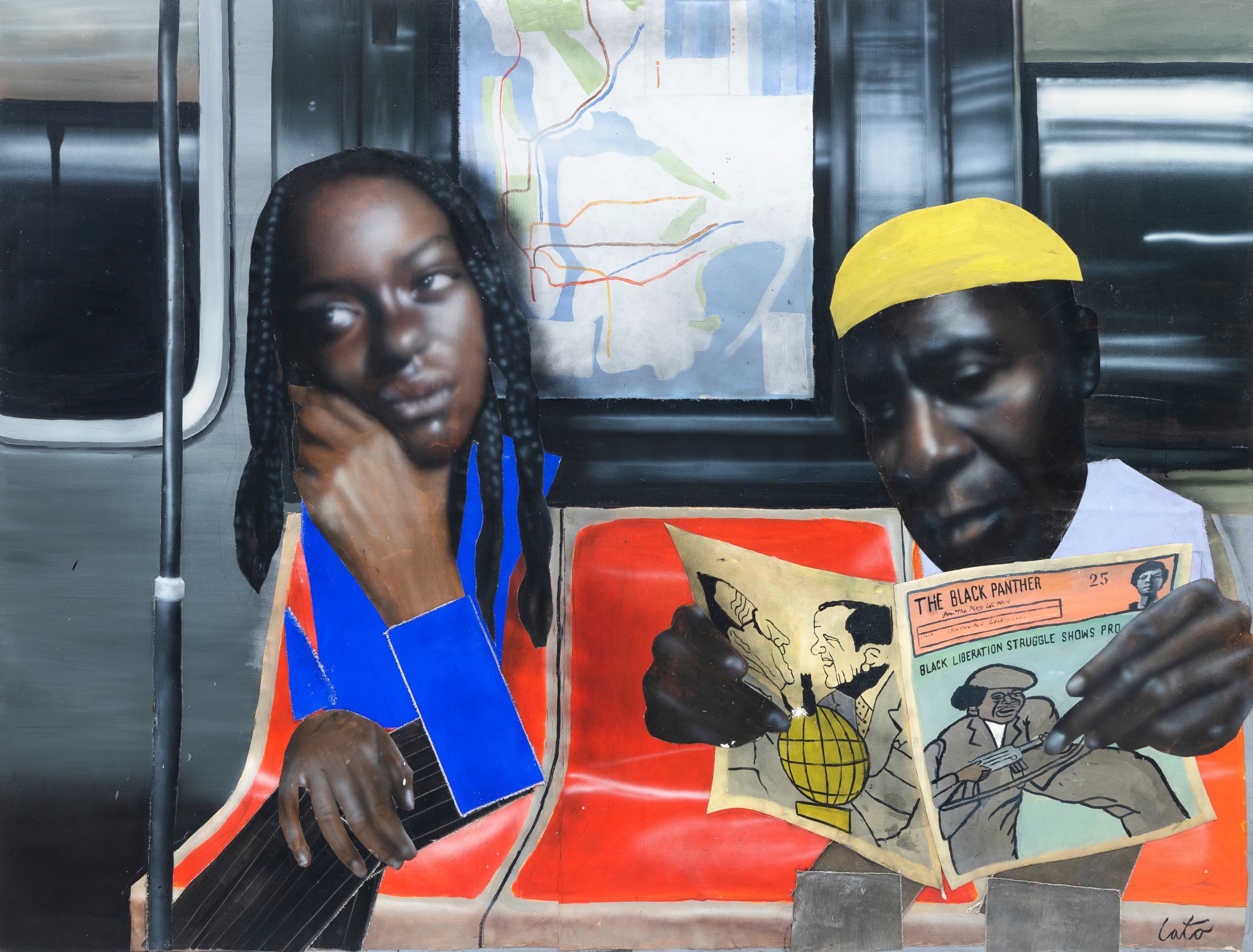 There is a deliberate disjuncture between the photorealist style of the heads and hands, and the loose geometric styles and patterns of the rest of the paintings, for which he uses brushes and paint rollers. These forms often suggest Cubist art, especially Picasso’s black and white paintings and his 1921 painting Three Musicians - which was made at the height of his Neoclassical period. Style shifting is a hallmark of Cato’s paintings, lending them a pointed strangeness at odds with the flashes of recognition he achieves.