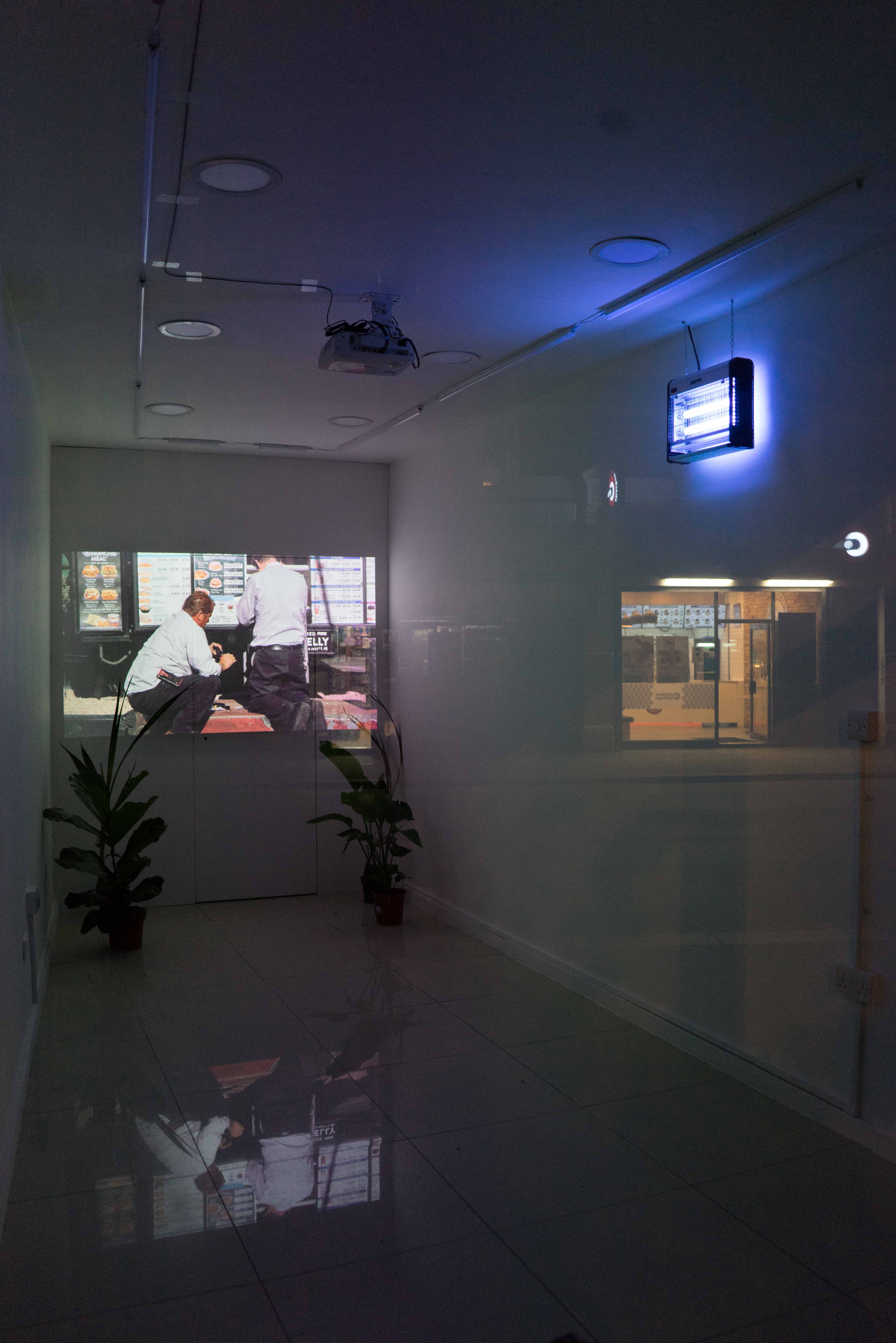 Within the gallery, a UV light attracting insects and tropical, prehistoric plants set the scene to an experimental video work.