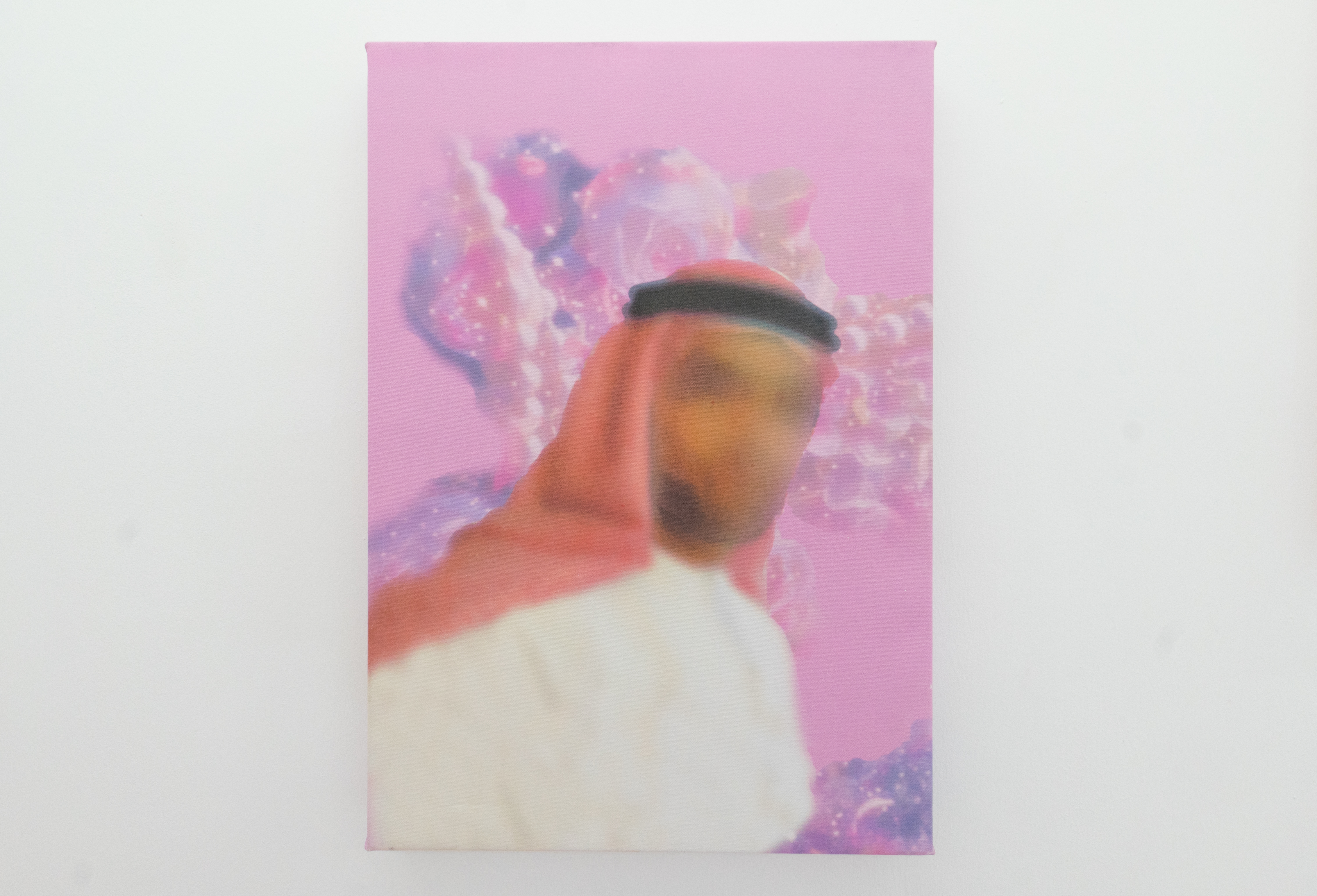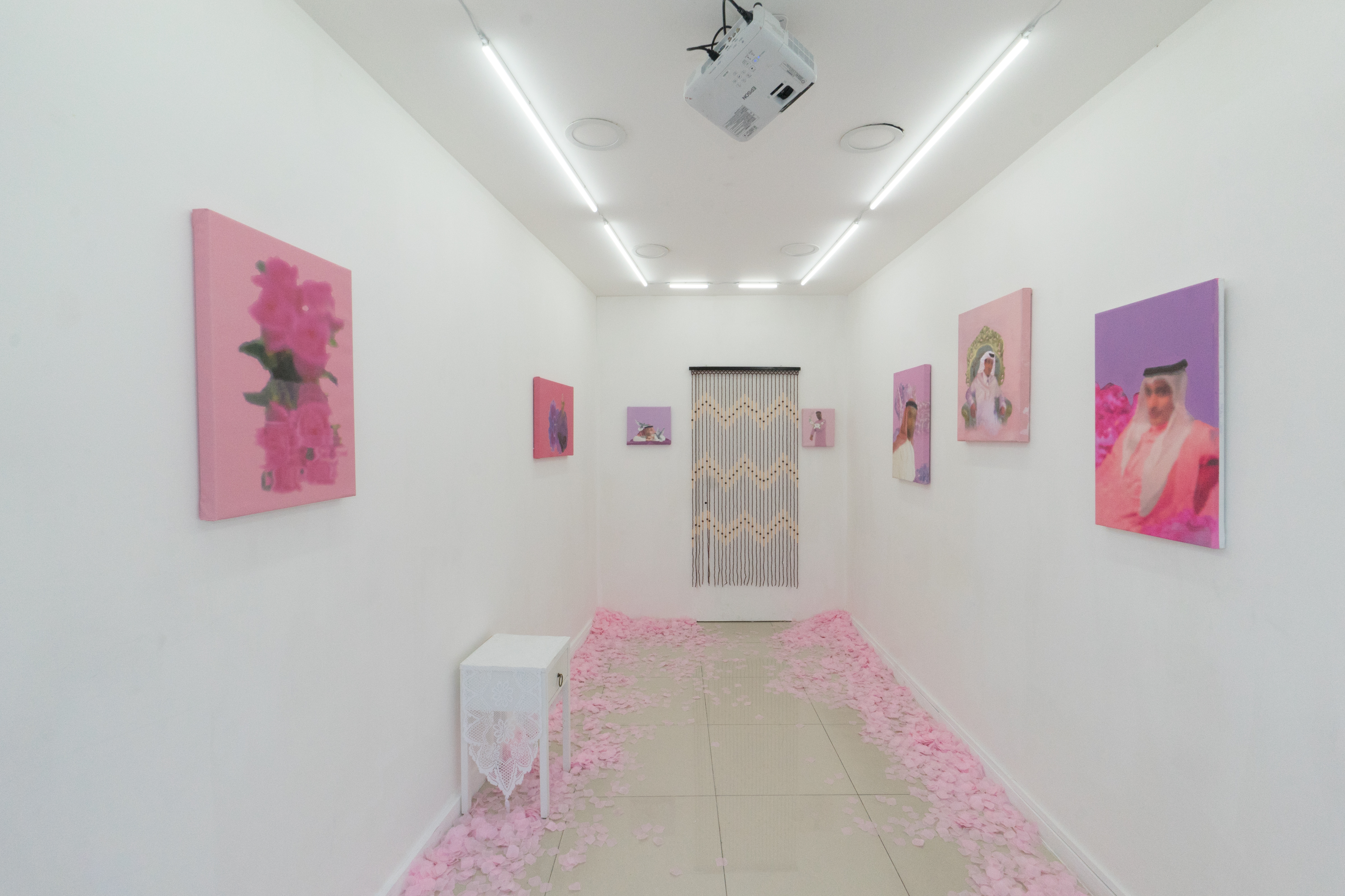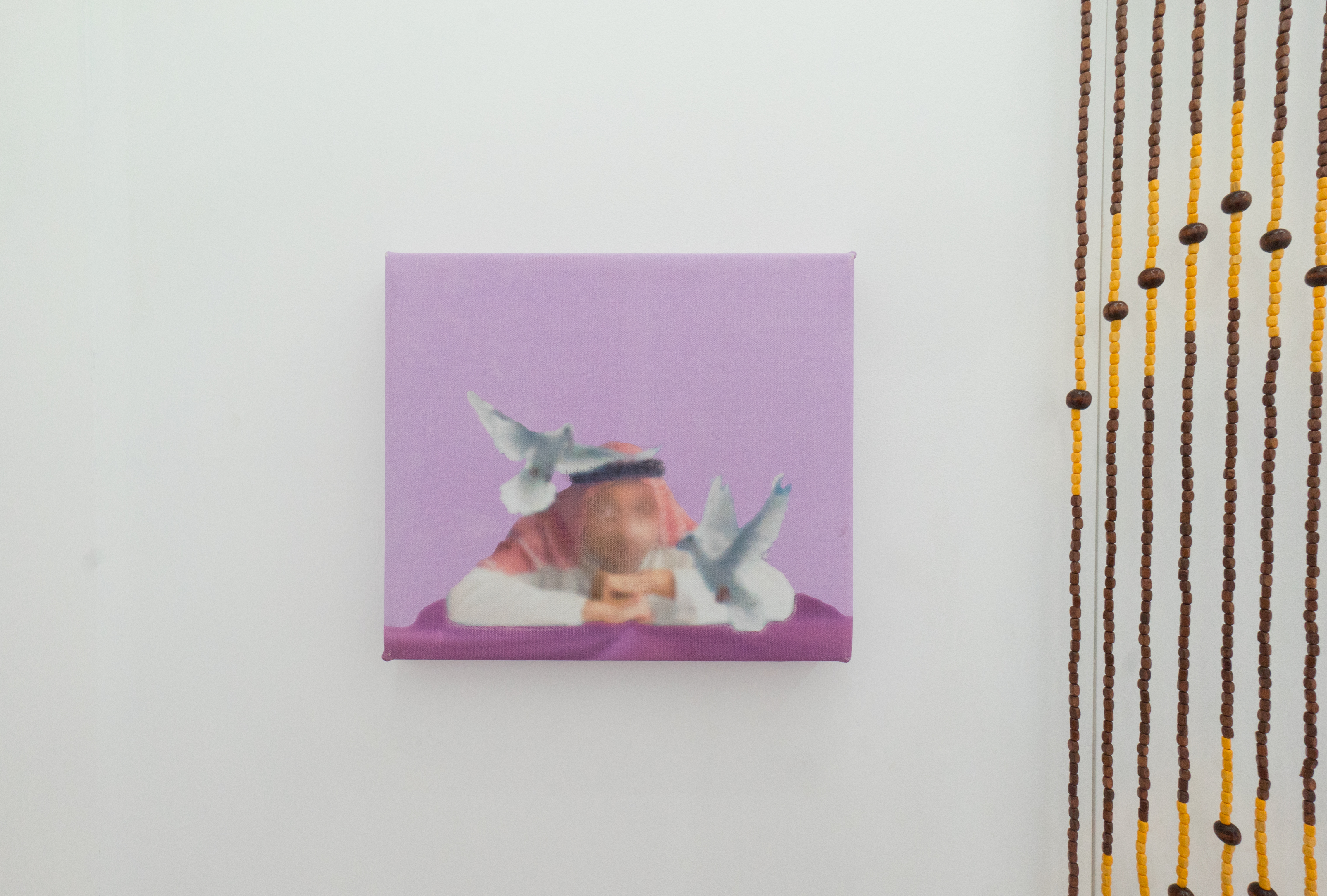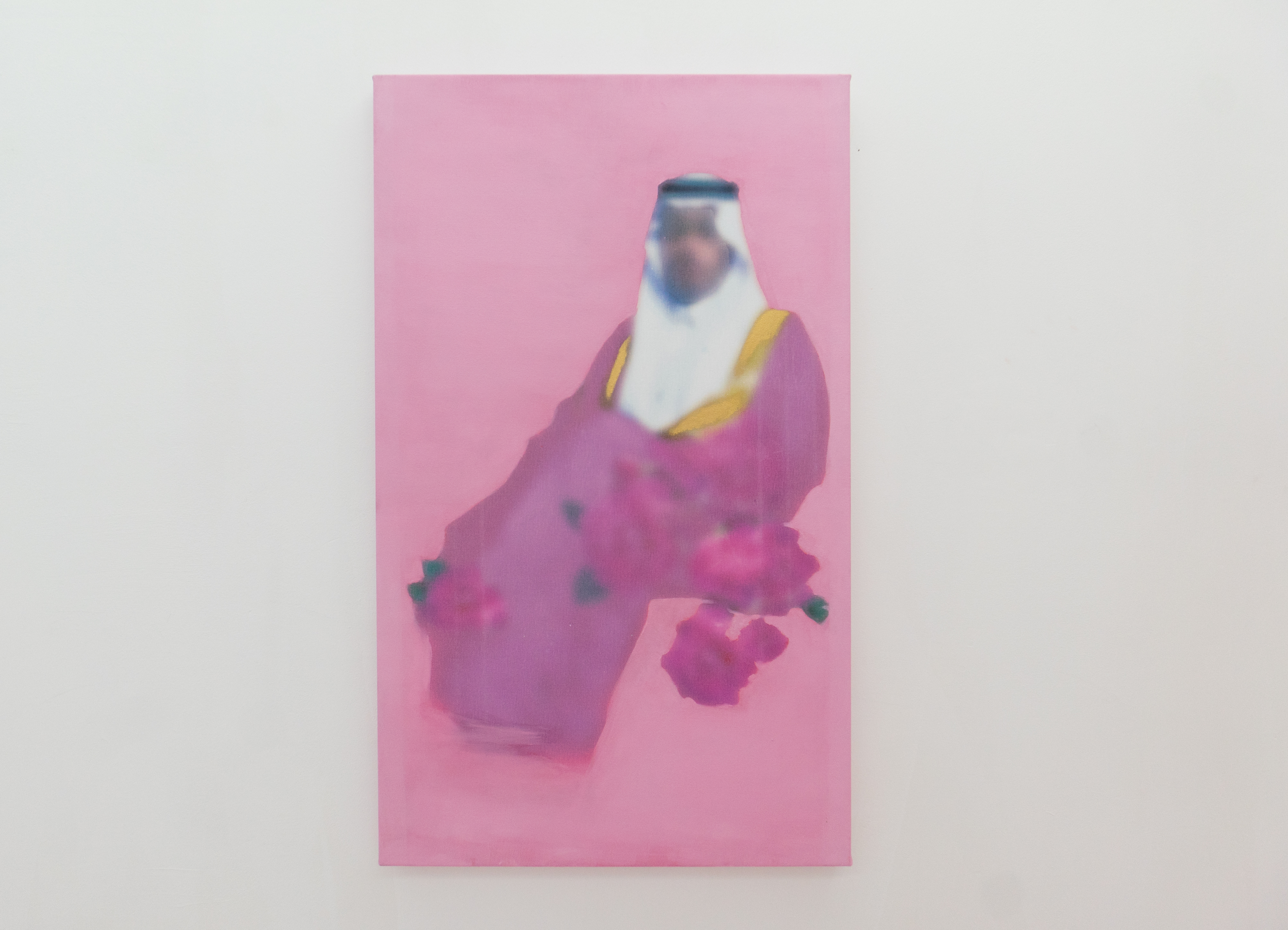 Al-Otaibi draws her references from early childhood memories of Saudi cultural and religious books on femininity and their aesthetics as well as the symbolism associated with female purity, beauty, chastity and vulnerability. By playfully portraying Saudi men in charming, romanticised scenarios, covered in exuberant flowers and often accompanied by white doves, she reverses and appropriates these inherited notions of gender and ironically refers to religious iconography of both Christianity and Islam.
