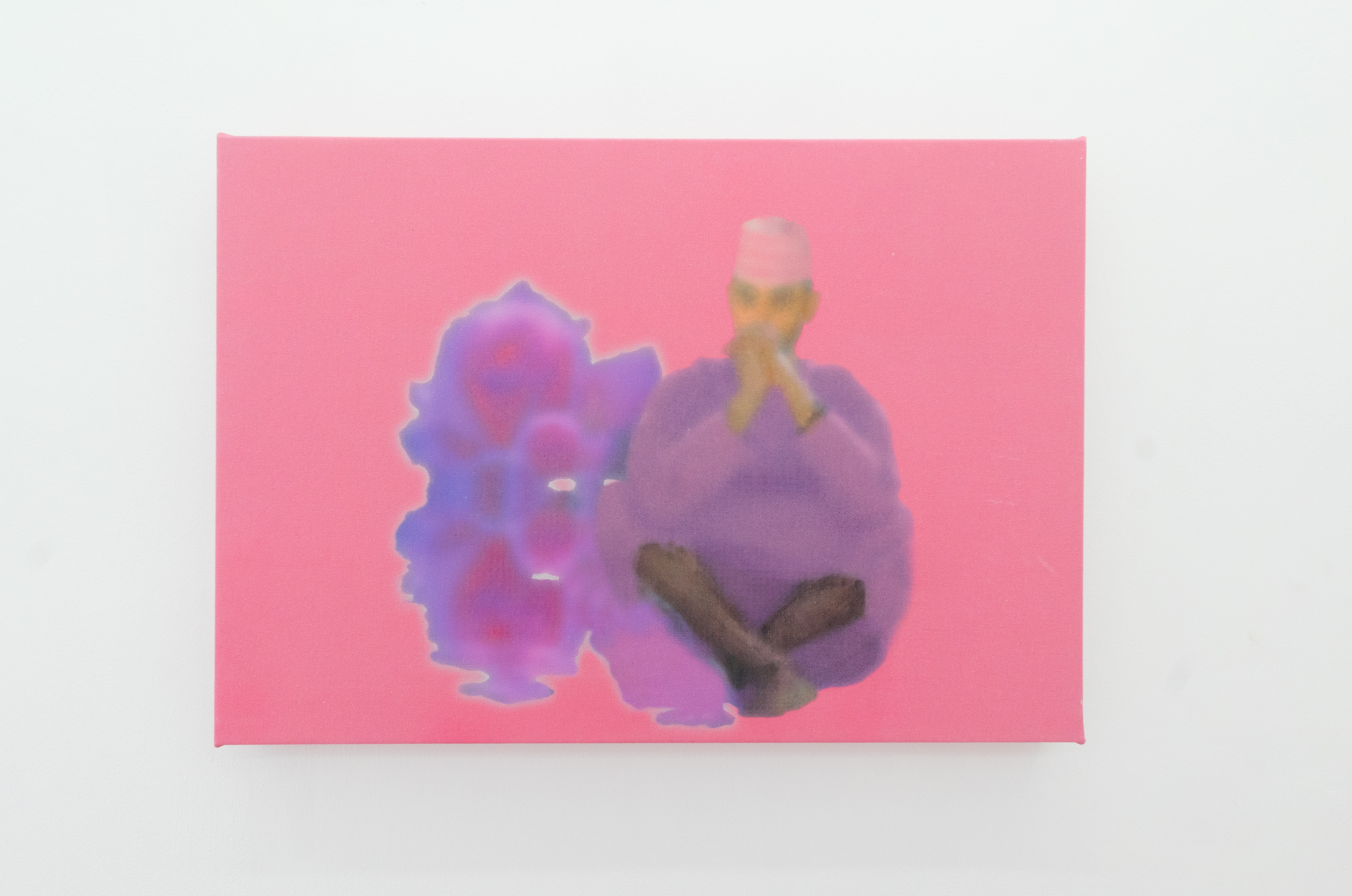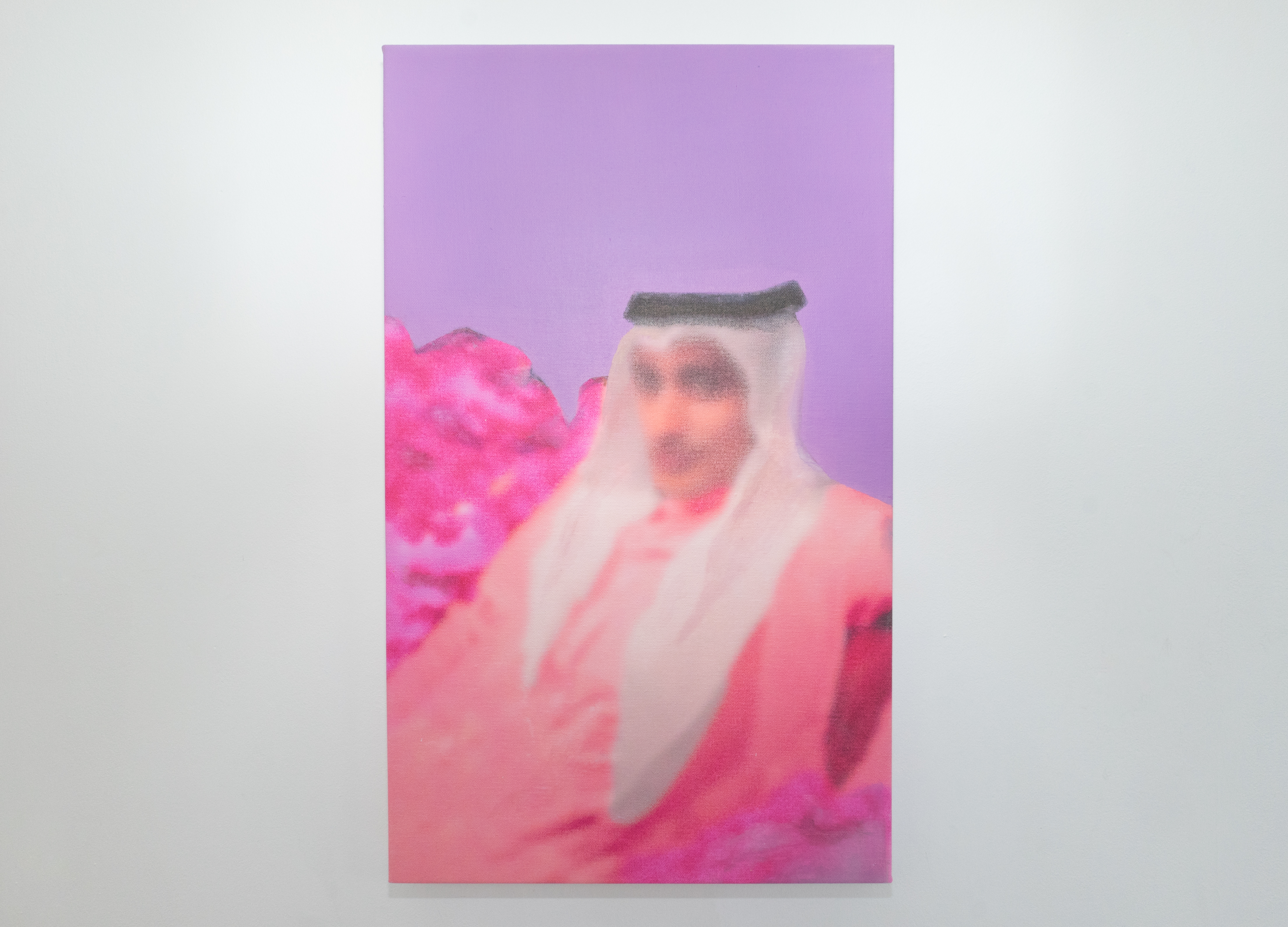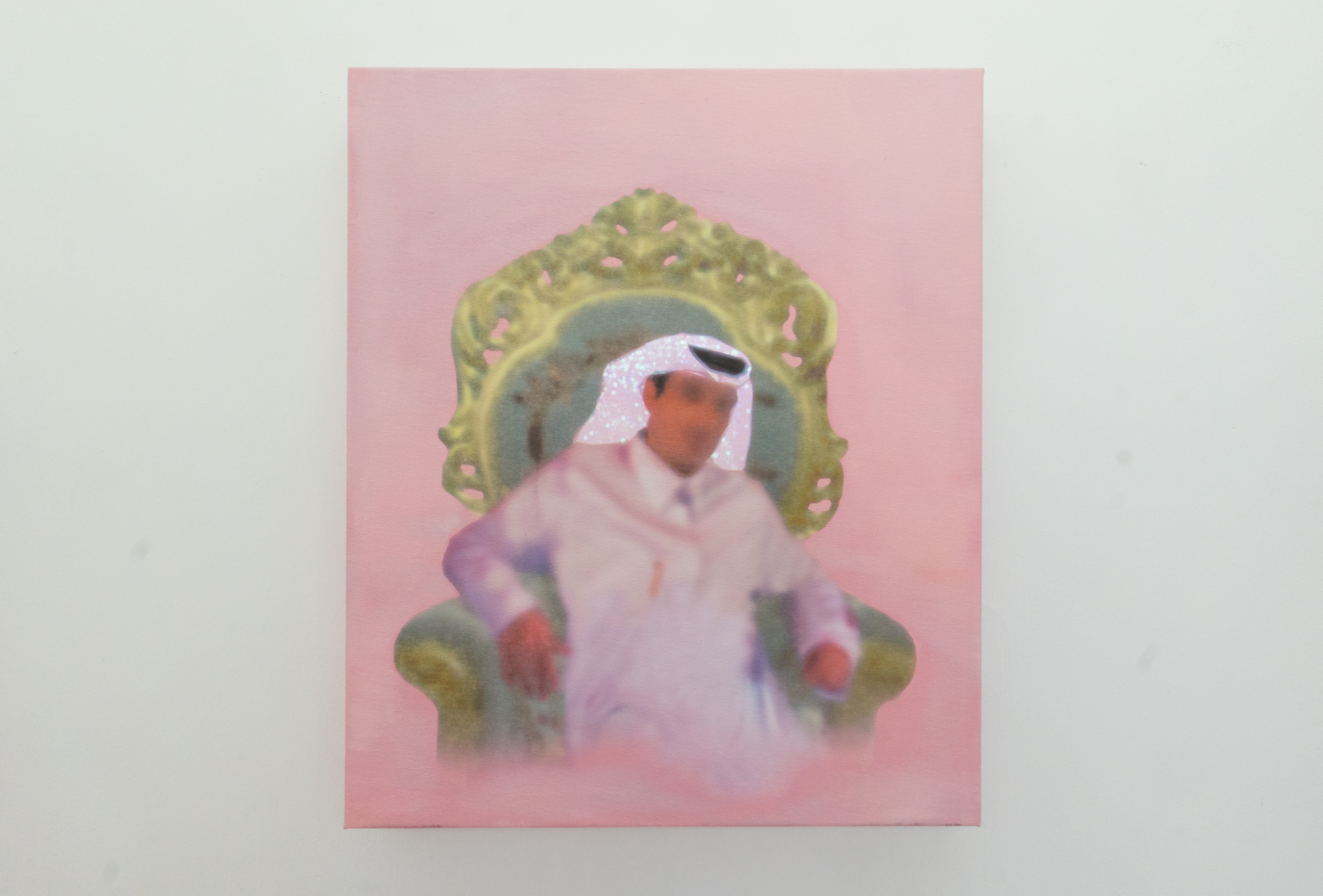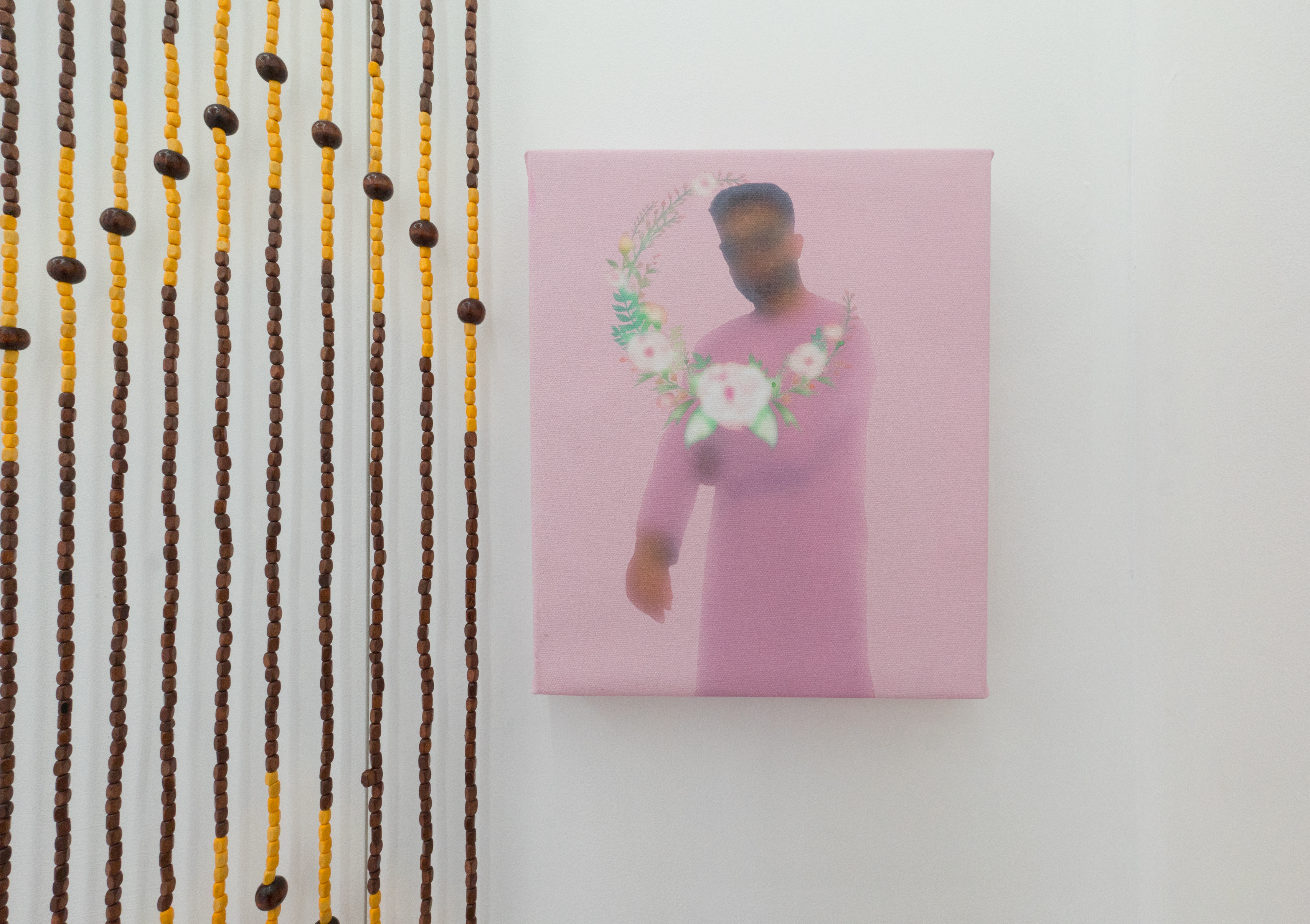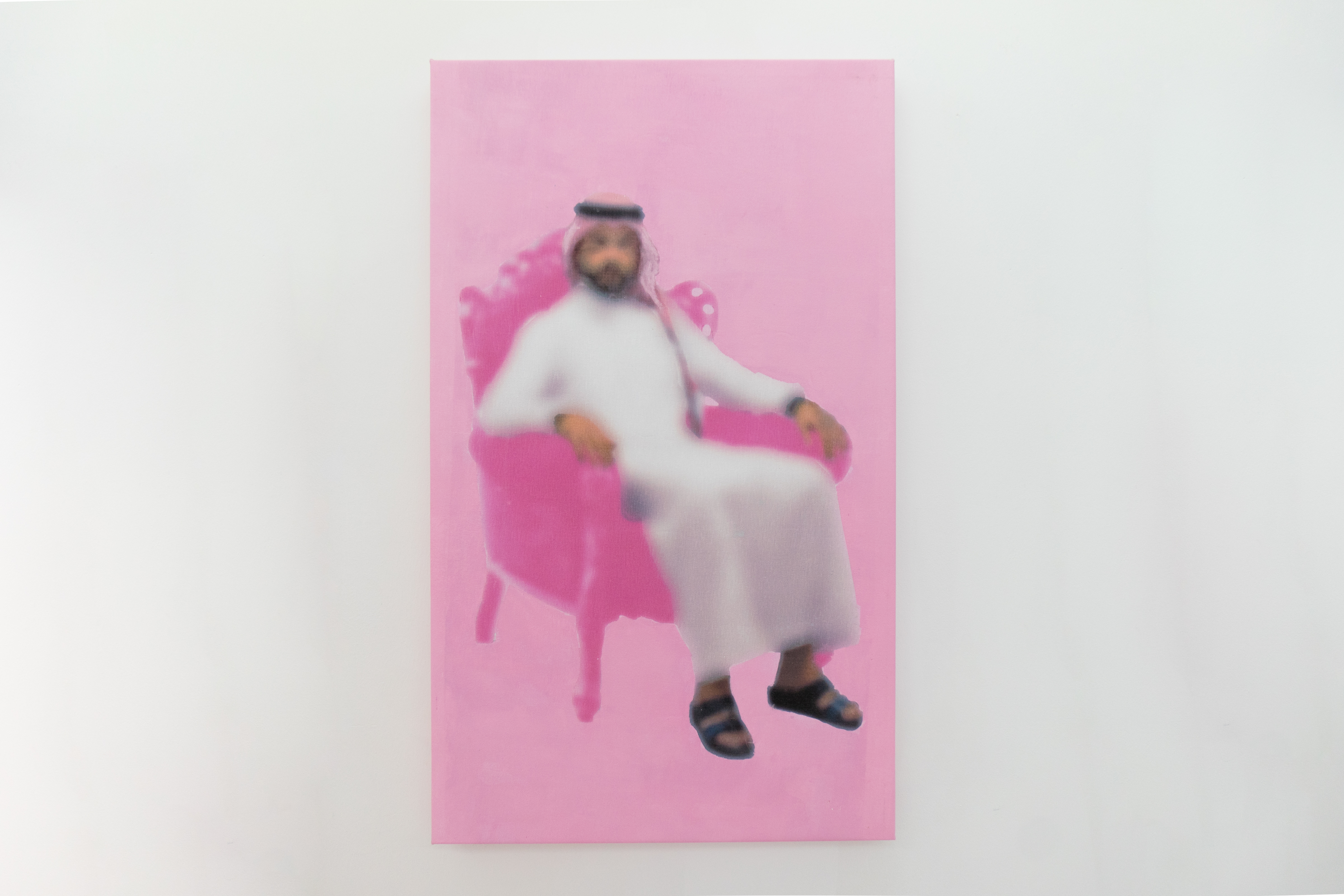 Al-Otaibi draws her references from early childhood memories of Saudi cultural and religious books on femininity and their aesthetics as well as the symbolism associated with female purity, beauty, chastity and vulnerability. By playfully portraying Saudi men in charming, romanticised scenarios, covered in exuberant flowers and often accompanied by white doves, she reverses and appropriates these inherited notions of gender and ironically refers to religious iconography of both Christianity and Islam.